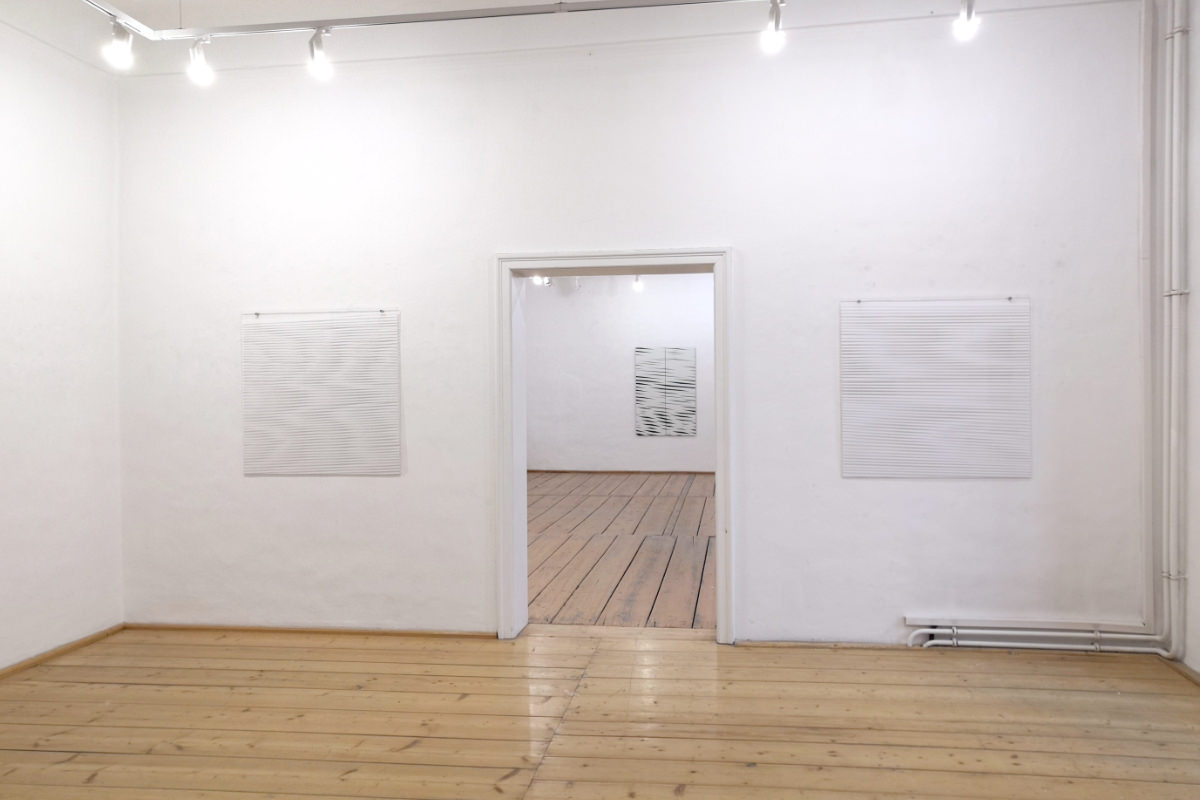 In these works, the same, non-parallel line grid was used twice by means of screen printing, once on the front and once on the back of the work. This made it possible for a grid structure to be superimposed on itself.