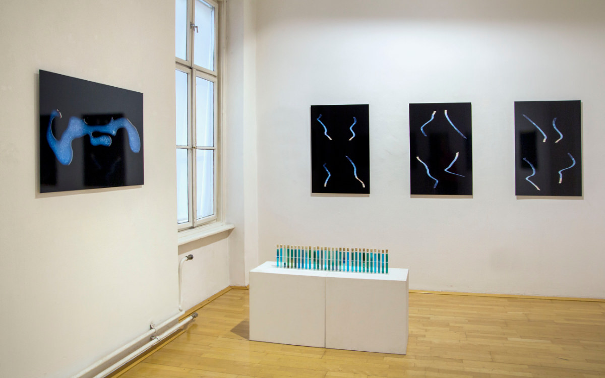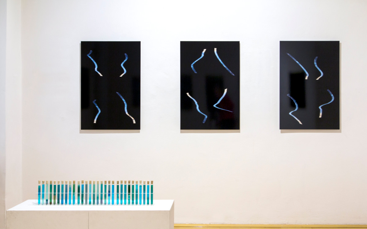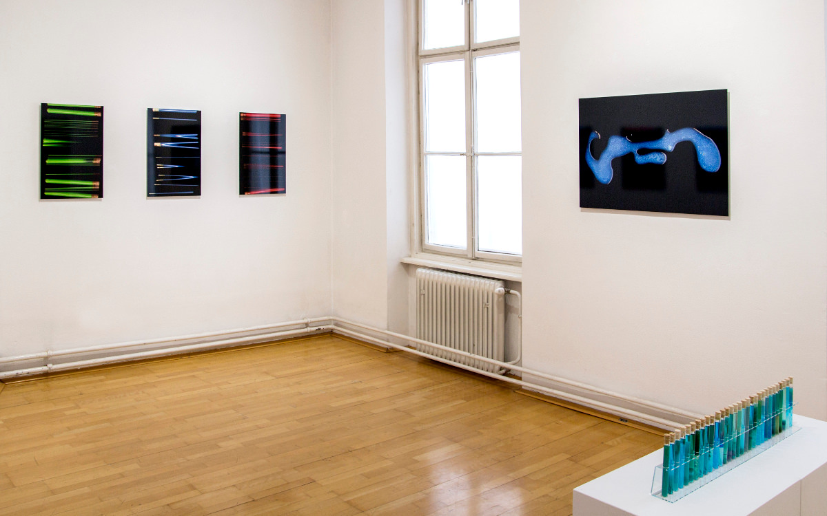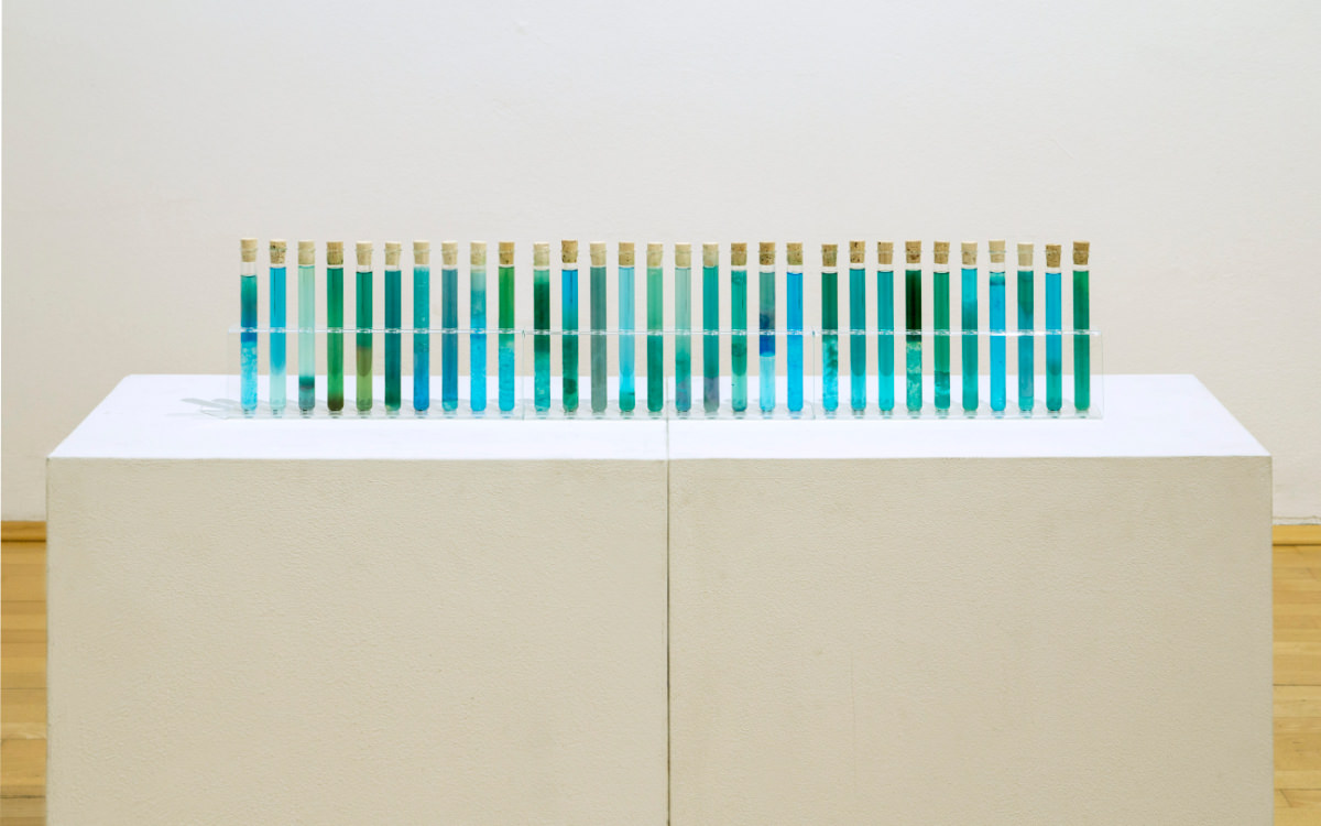2014, blaue Reinigungsflüssigkeiten in Eprouvettenröhrchen, ca 10 x 120 cm